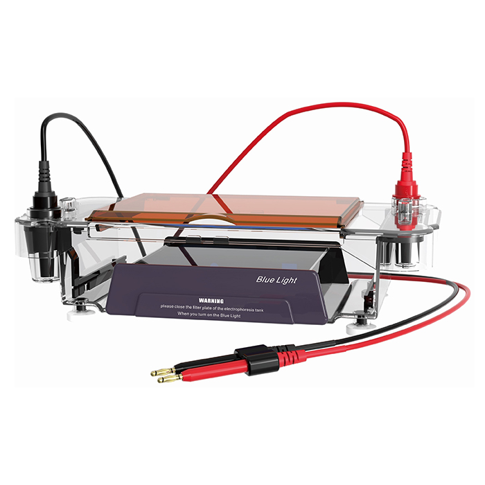 Horizontální elektroforetická komora pohání migraci nabitých molekul v gelu elektrickým polem a odděluje molekuly na základě jejich rozdílných migračních rychlostí v elektrickém poli. Gel se umístí do elektroforetické nádrže a vzorek se vloží do gelu přes nádržku na vzorky. Elektrody připojené ke zdroji energie generují elektrické pole, které odděluje molekuly ve vzorku podle rozdílů v molekulární velikosti, náboji nebo morfologii. Během tohoto procesu je elektroforéza sledována v elektroforézní nádrži pomocí modrého světla, které umožňuje sledovat separaci vzorku v reálném čase. Jak elektroforéza postupuje, vzorky se postupně oddělují a tvoří pruhy. Zařízení pro sledování v reálném čase pomocí modrého světla pomáhá experimentátorovi kdykoli zkontrolovat stav elektroforézních pruhů a zajistit tak hladký průběh experimentu. Současně design odklápěcího krytu a funkce automatického vypnutí zajišťují bezpečnost experimentálního personálu.